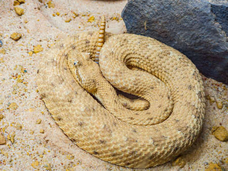 Horned rattlesnake or sidewinder rattlesnake (lat.- Crotalus cerastes) in zoo enclosure
