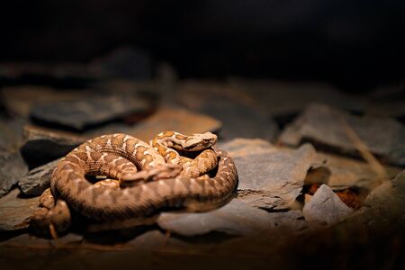 Rock viper, Montivipera xanthina, Ottoman coastal viper in nature habitat. Wildlife scene from nature. Snake at rocky mountain habitat, lying on the stone, night image.