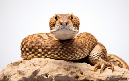 Desert Horned Viper is elegantly coiled featuring distinct horns above its eyes captured on a white backdrop with minimal shadows highlighting its natural beauty.