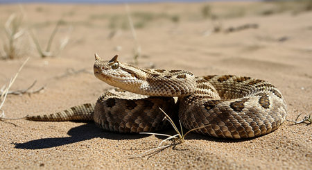 A horned viper coiled in the sand, with its horns raised and eyes fixed on the horizon, ready to strike.