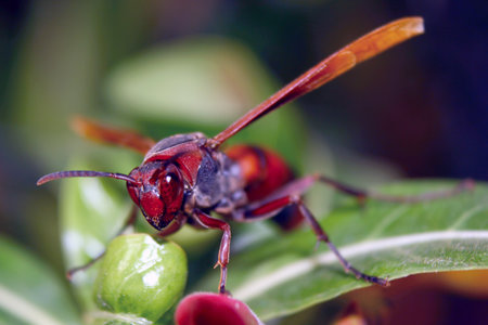 Red wasp with spread wings and antennae standing on a vibrant green leaf, creating a striking contrast against a soft-focus background, showcasing the insect's intricate details