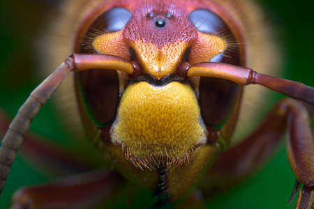 Close up view of live European hornet. Largest wasp in Europe. Green background.