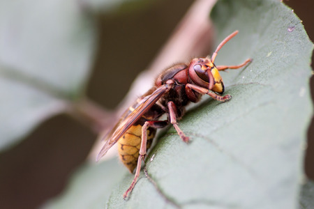 A hornet on a green leaf in macro close-up with details. A poisonous dangerous insect.