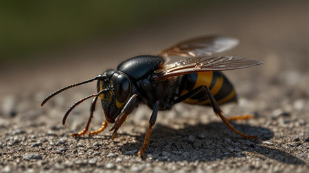 Close up of a Wasp on the ground. Macro shot.
