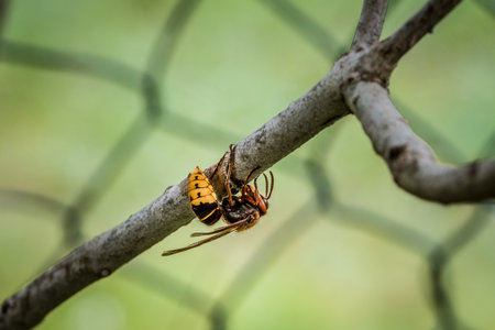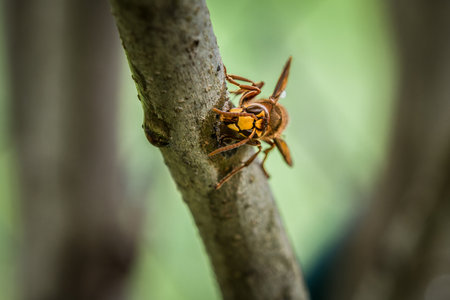 Detailed close up shot of an Asian hornet on nest with excellent natural lighting for photography