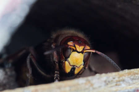 Portrait of a big wasp - a hornet about an entrance to a nest.