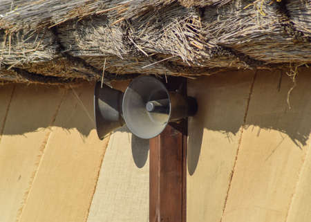 Vintage horn loudspeakers on a wall under a thatched roof. Horn speaker.