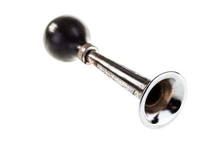 Street sign banning tooting horns round red circle with crossed line through picture of horn.
