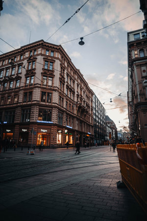 View of Kluuvikatu street, Helsinki, Finland. People walk down street on a summer evening