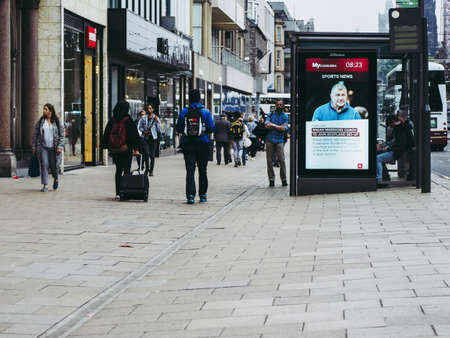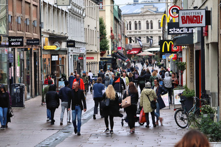 GOTHENBURG, SWEDEN - AUGUST 27, 2018: People shop at Kungsgatan street in Gothenburg, Sweden. Gothenburg is the 2nd largest city in Sweden with 1 million inhabitants in the metropolitan area.