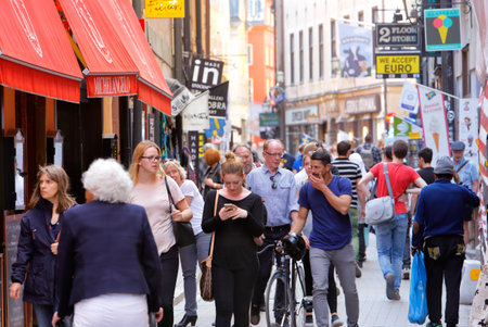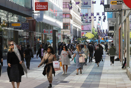 Stockholm, Sweden - May 12, 2021: People walking the crowded pedestrian only Drottninggatan street a shopping area in the downtown district.