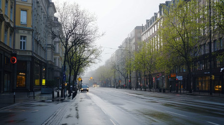 A tranquil city street shrouded in fog during early morning, showcasing empty lanes lined with budding trees and contemporary buildings, evoking a serene atmosphere.