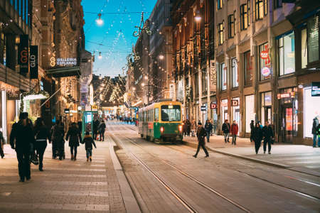 Helsinki, Finland - December 6, 2016: Tram Departs From Stop On Aleksanterinkatu Street. Night Evening Christmas Xmas New Year Festive Street Illumination. Beautiful Decorations During Winter Holidays