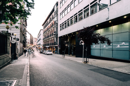 Stockholm, Sweden - November 17, 2018. Street view on Klarabergsgatan street in Stockholm, with residential and commercial buildings, commercial properties, street traffic and blurred figures of people.