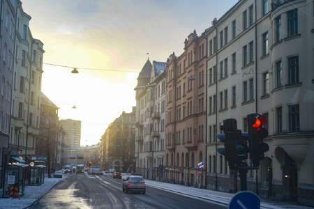 Stockholm, Sweden. Sunshine During Sunset Above Stockholm Street. Beautiful Street With Multi-storey House In Sunny Summer Evening. Cozy Side Street.