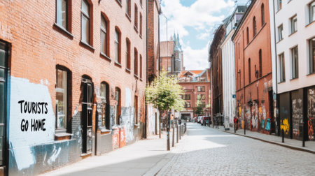 Curvy narrow street with residential buildings and protest graffiti Tourists Go Home, overtourism concept, AI Generated