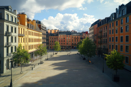 A sunny midday in a lively city square surrounded by colorful buildings and gentle shadows from trees.