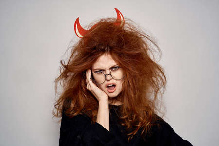 Brunette in a devil costume on Halloween red horns glasses black dress