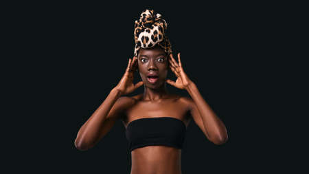 Surprised girl wear african turban with open mouth