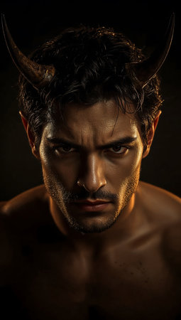 Portrait of a young man with horns on a black background.