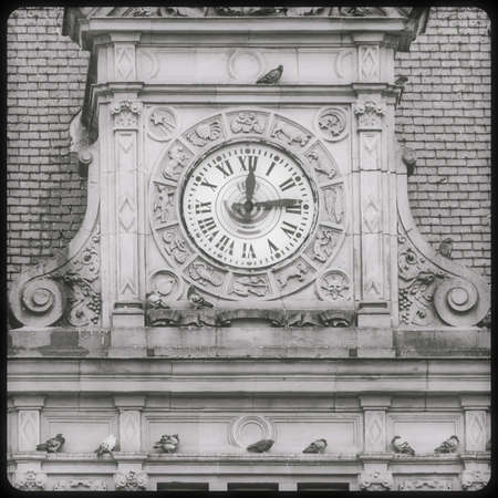 Street city clock on the wall. previously morning working hours concept