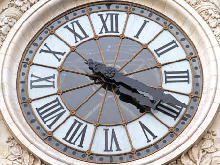 Closeup of antique clock face with black and white roman numerals