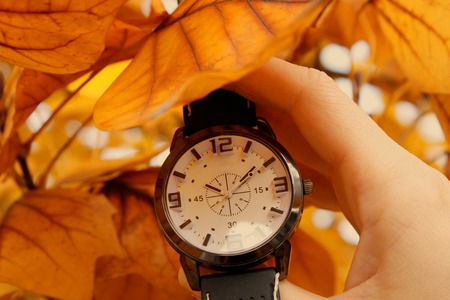 Vintage Pocket watch in man's hand and smart watch on the wrist against the background of autumn dried brown leaves