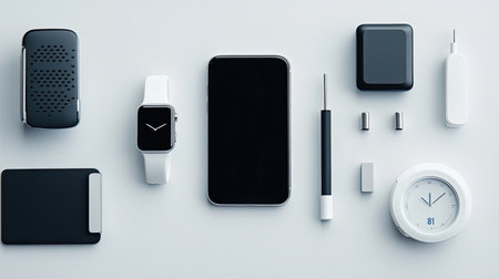 A sleek and minimal flat lay featuring a smartphone, smartwatch, and various modern gadgets on a light gray background. Ideal for technology and lifestyle themes.