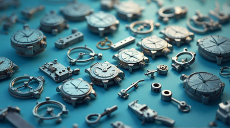 Intricate mechanical watch parts laid out on a clean blue surface showcasing precision engineering and craftsmanship