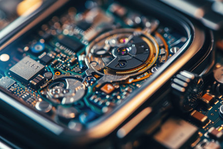 A detailed shot showcasing the stainless steel watch face with a black dial, silver hour markers, and precise hands, Inside of a modern smartwatch focusing on the circuit board, AI Generated