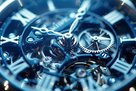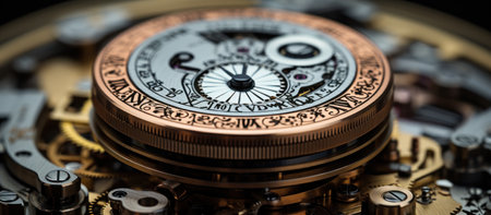 Gears and cogs in clockwork watch mechanism. Craft and precision - elegant detailed stainless steel and metal. AI generated illustration