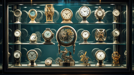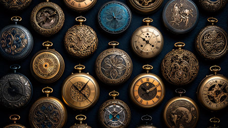Old-fashioned clocks with Roman numerals show various times, creating a sense of timelessness and nostalgia.