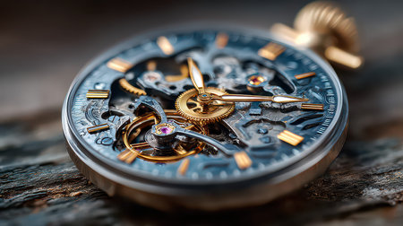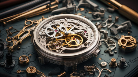 This captivating image showcases a vintage pocket watch surrounded by various clockwork gears and tools on a rustic workbench, evoking nostalgia.