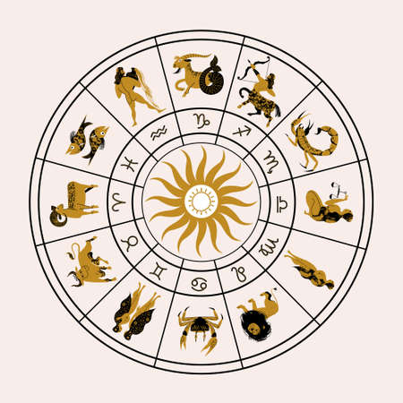 Horoscope and astrology. Horoscope wheel with the twelve signs of the zodiac. Zodiacal circle. Zodiac signs Aries, Taurus, Gemini, Cancer, Leo, Virgo, Libra, Scorpio, Sagittarius, Capricorn, Aquarius, Pisces. Vector illustration.