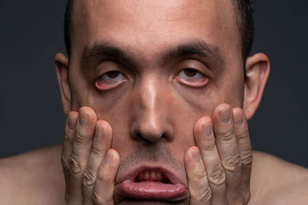 Portrait of adult bearded man with emotion of saddness on face looking at camera