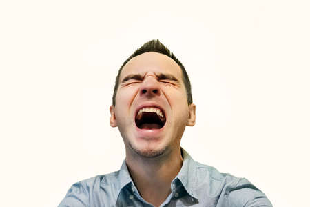 An angry aggressive man screams with mouth open. A human cry at a child or a quarrel in the family. Anger and negative emotion with scream on a red background