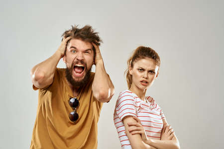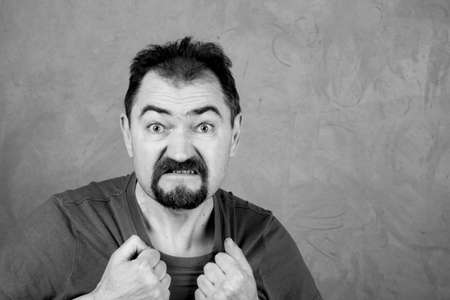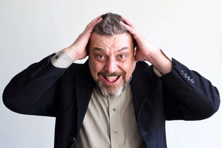 A man with a beard in a tantrum Facial expression of panic, fear, failure Concept: business collapse, bankruptcy, stress, defeat. Humor, a joke.