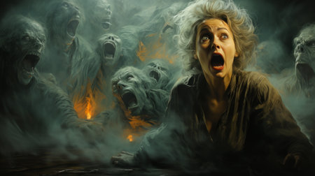 a creepy and unsettling black and white painting featuring an ashley shouting, surrounded by eerie shadows on the wall. this artwork evokes a strong sense of loneliness and is reminiscent of a realistic pencil sketch on paper. ai generated