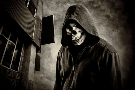 Scary monster or grim reaper ghost coming out of the dark shadows to haunt during Halloween. Depicts a scary and deadly fictitious demon