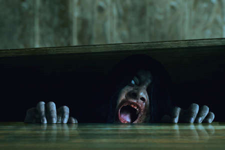 Horror scene of ghost woman death movie film Halloween festival in the dark house nightmare screaming on hell is monster devil girl or female dead characters at night evil dressing wraith spirit theme