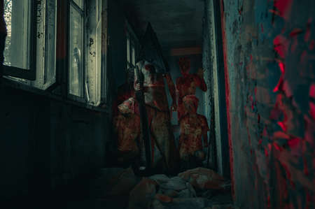 Dnipro, Ukraine - June 27, 2020: Cosplayers in the image of Dark Nurses and executioner Red Pyramid from the horror movie Silent Hill stand in dark room.