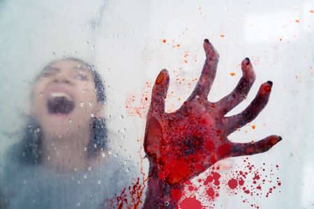 Halloween horror concept. Close up of screaming woman haunted by bloody hand in the bathroom