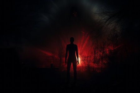 a person standing in the dark with a red light coming from behind them