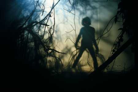 bloodthirsty zombies attacking concept. Silhouette of scary zombie walking in the dead forest at night. Creative table decorations. Selective focus