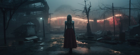 Nighttime abandoned amusement park with sanatorium, ferris wheel, and foggy park. Background concept for Halloween.