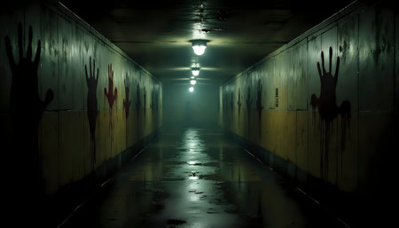 Underground Tunnel With Bloody Handprints On Walls