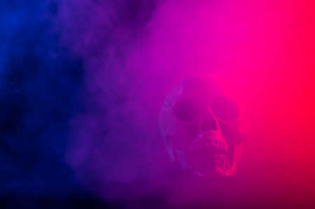 Human skull in pink and blue smoke on a black background. Halloween.