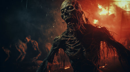 Bloodthirsty zombies in the cemetery. Halloween. Horror film.