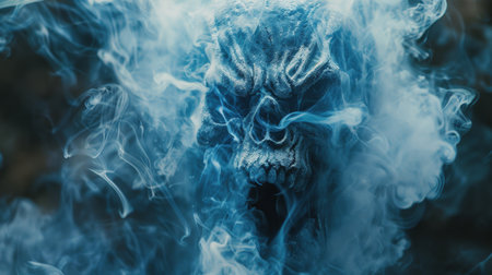 A mysterious figure with a skull mask reaches out from a swirling mist, creating an eerie and unsettling scene.