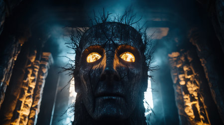 the demon warrior, a terrifying creature from a 1980s grindhouse movie, emerges from the darkness of the night, surrounded by an eerie glow, in this hyper-realistic, hyper-grainy, and intricately detailed film still, reminiscent of a 1970s japanese horror claymation movie poster, captured with a canon eos r3 camera and 50mm f/1.8 lens, showcasing exceptional cinematography and color grading. ai generated